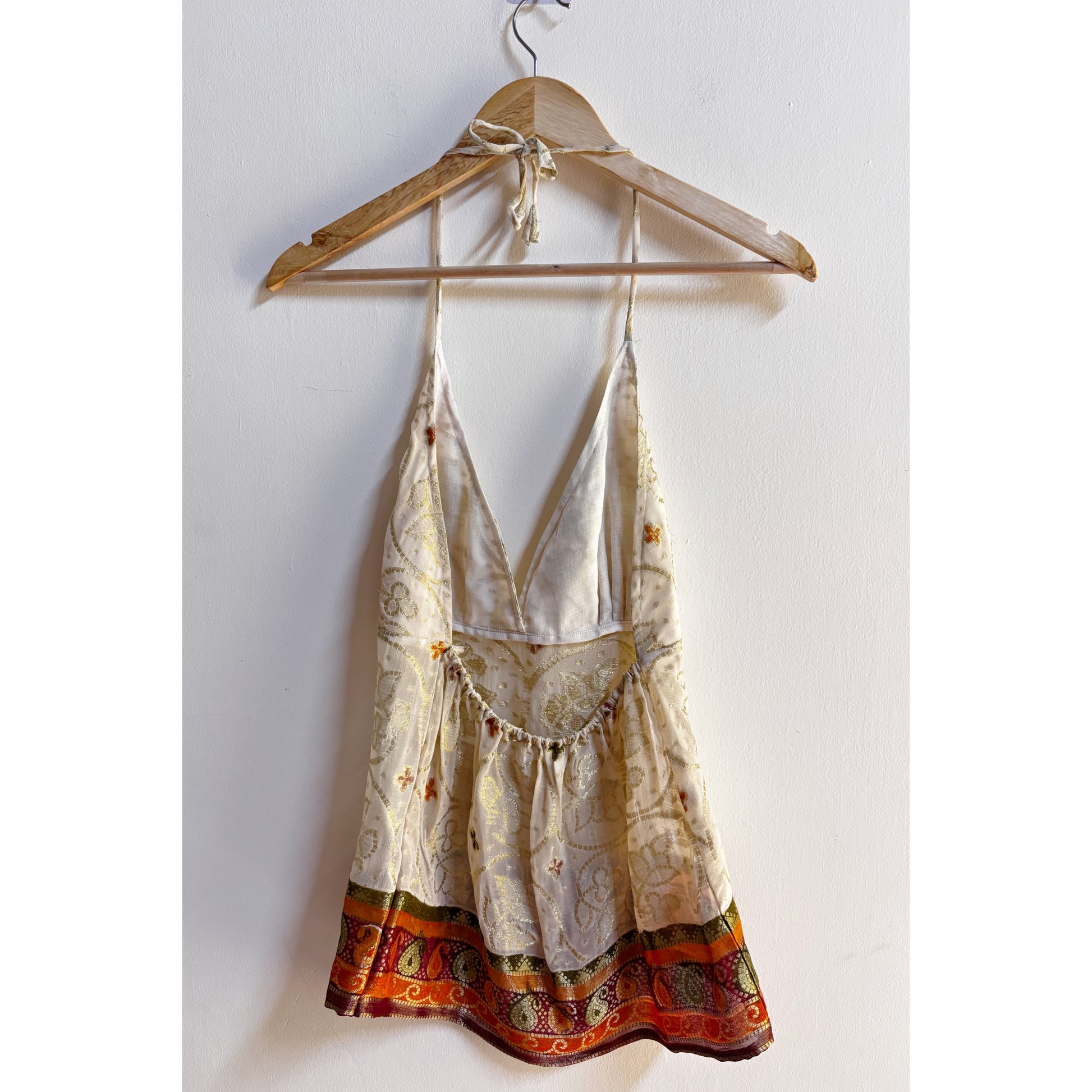 Silk. Brocade. Bust lined with georgette. Halter neck. Backless. Weaved.