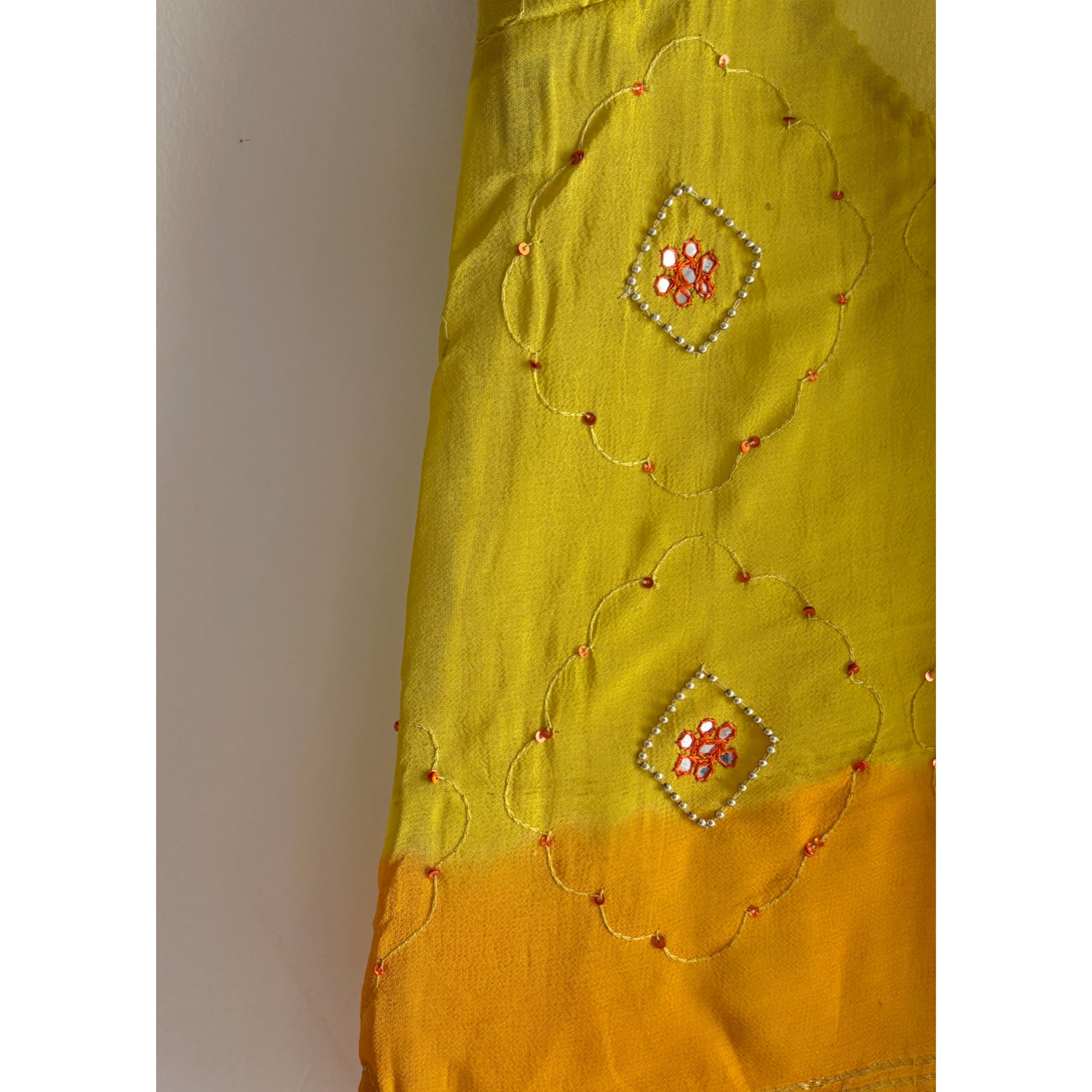 Georgette. Bust lined with cotton. Mirror with bead and thread hand work. Halter neck