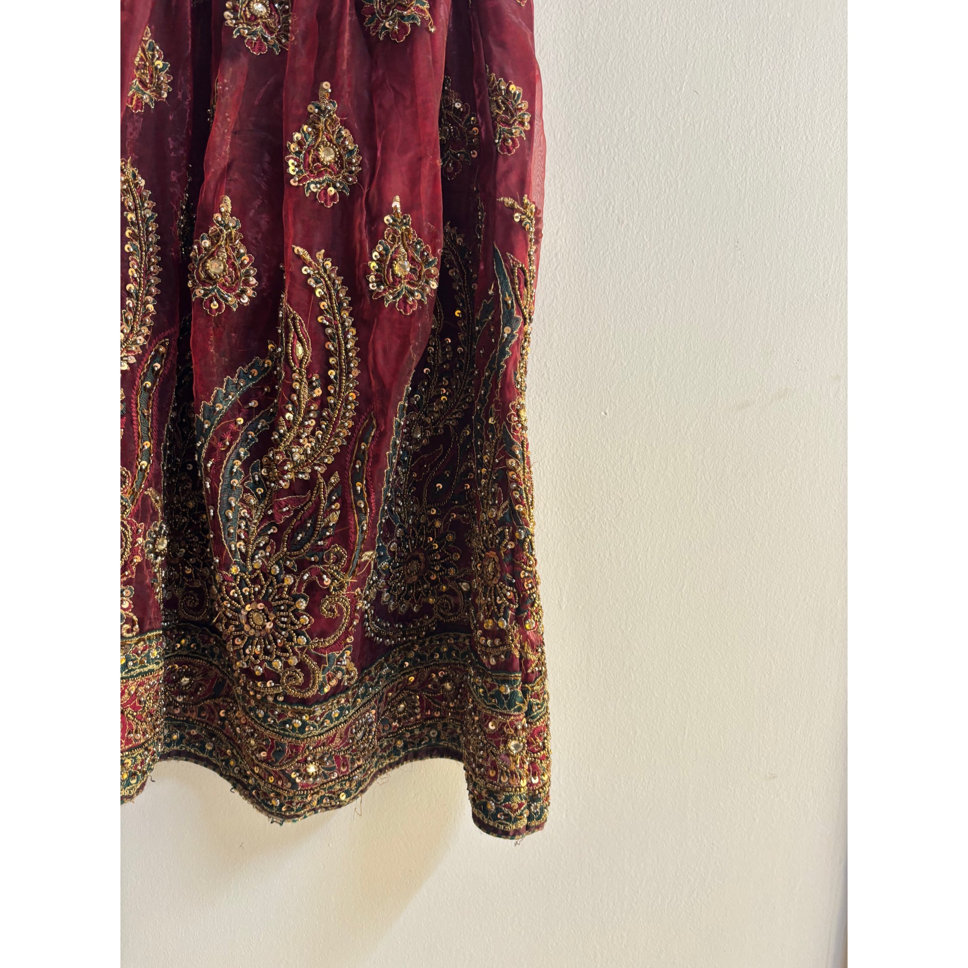 Stunning handcrafted maroon halter dress, adorned with intricate gold and green threadwork and beading. Each motif is meticulously hand-embroidered, showcasing rich traditional artistry with a modern silhouette. The plunging neckline and backless design add a bold, elegant touch, while the flared hem is embellished with ornate patterns that shimmer with movement.