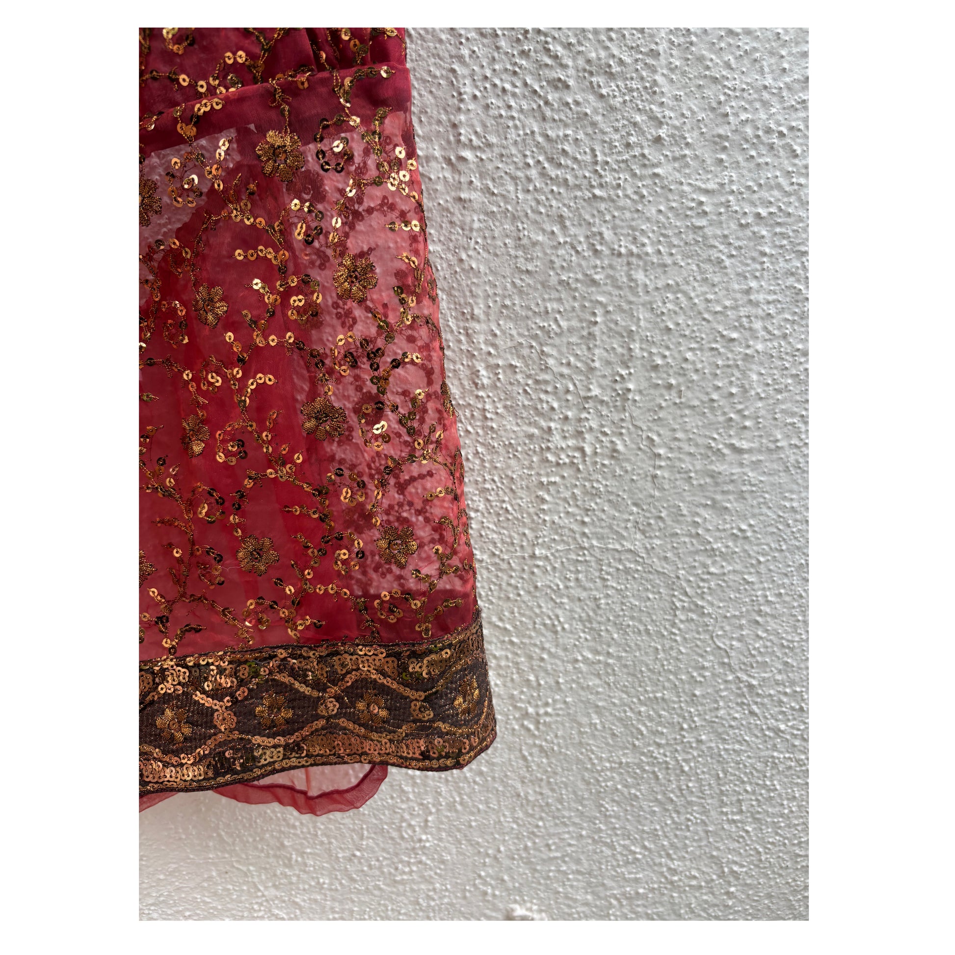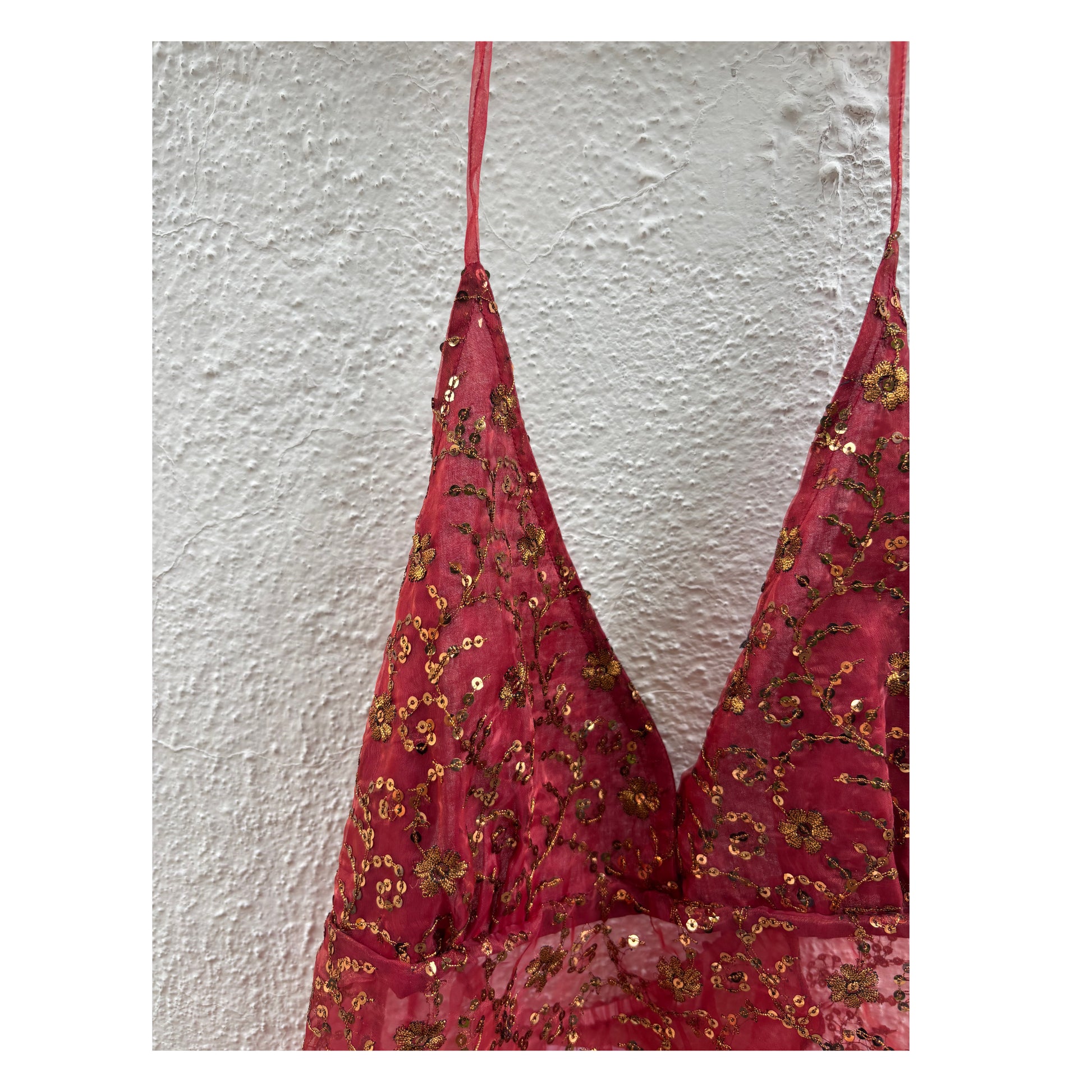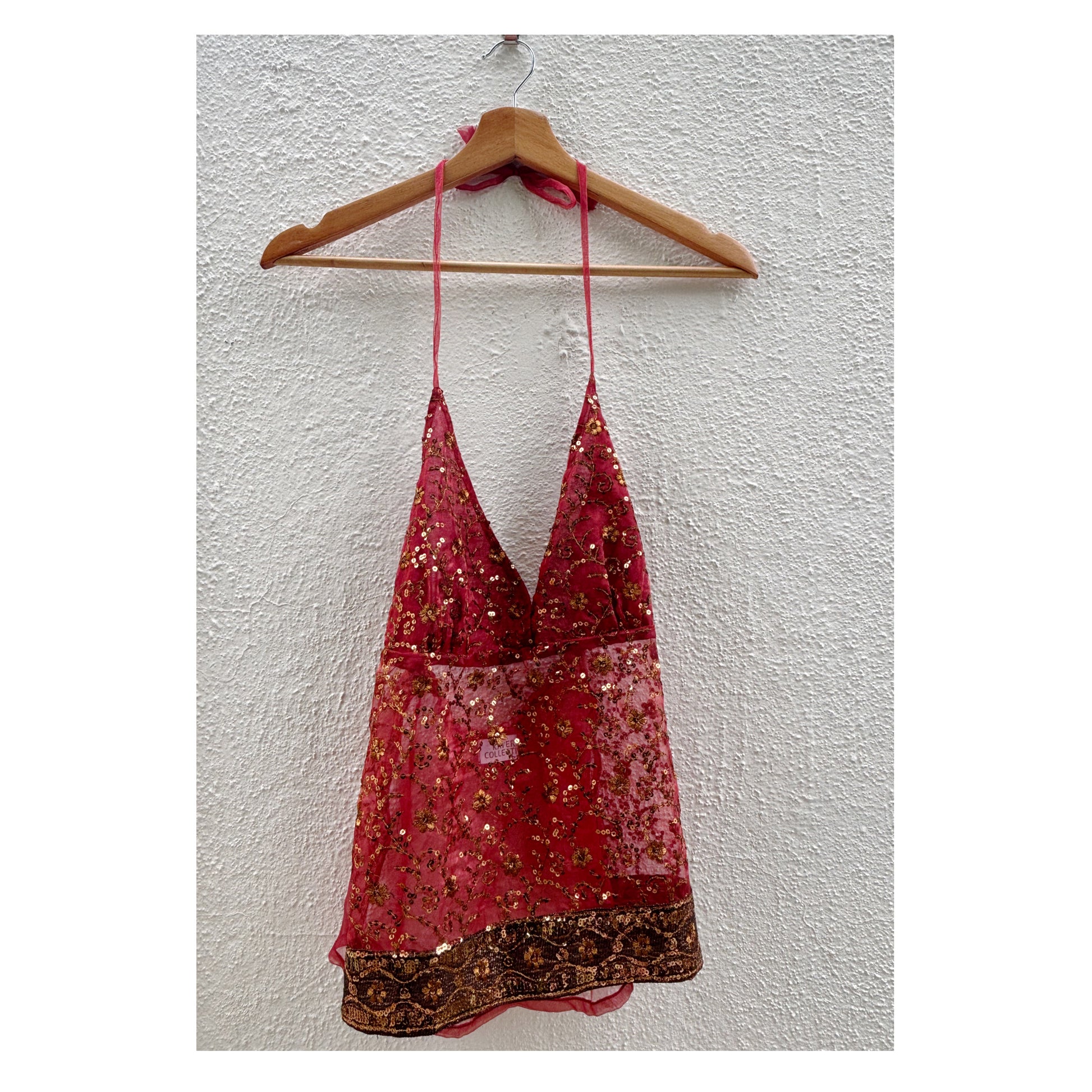 Halter top is covered in dazzling gold sequins with embroidered border and lined with cotton. Made from organza with a statement silhouette that’s equal parts vintage and glam.