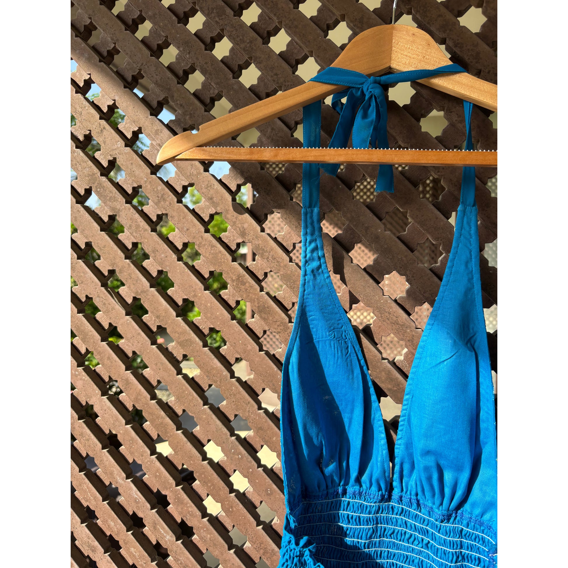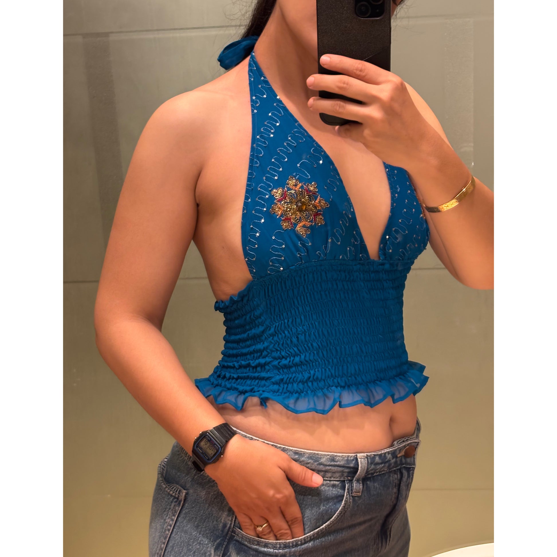 Make a bold and elegant statement with this cobalt blue halter top, adorned with intricate floral hand embroidery and mirror accents. The soft smocked waist hugs your body comfortably while the sheer ruffle hem adds a romantic touch. Designed for bold hearts and easy movers.