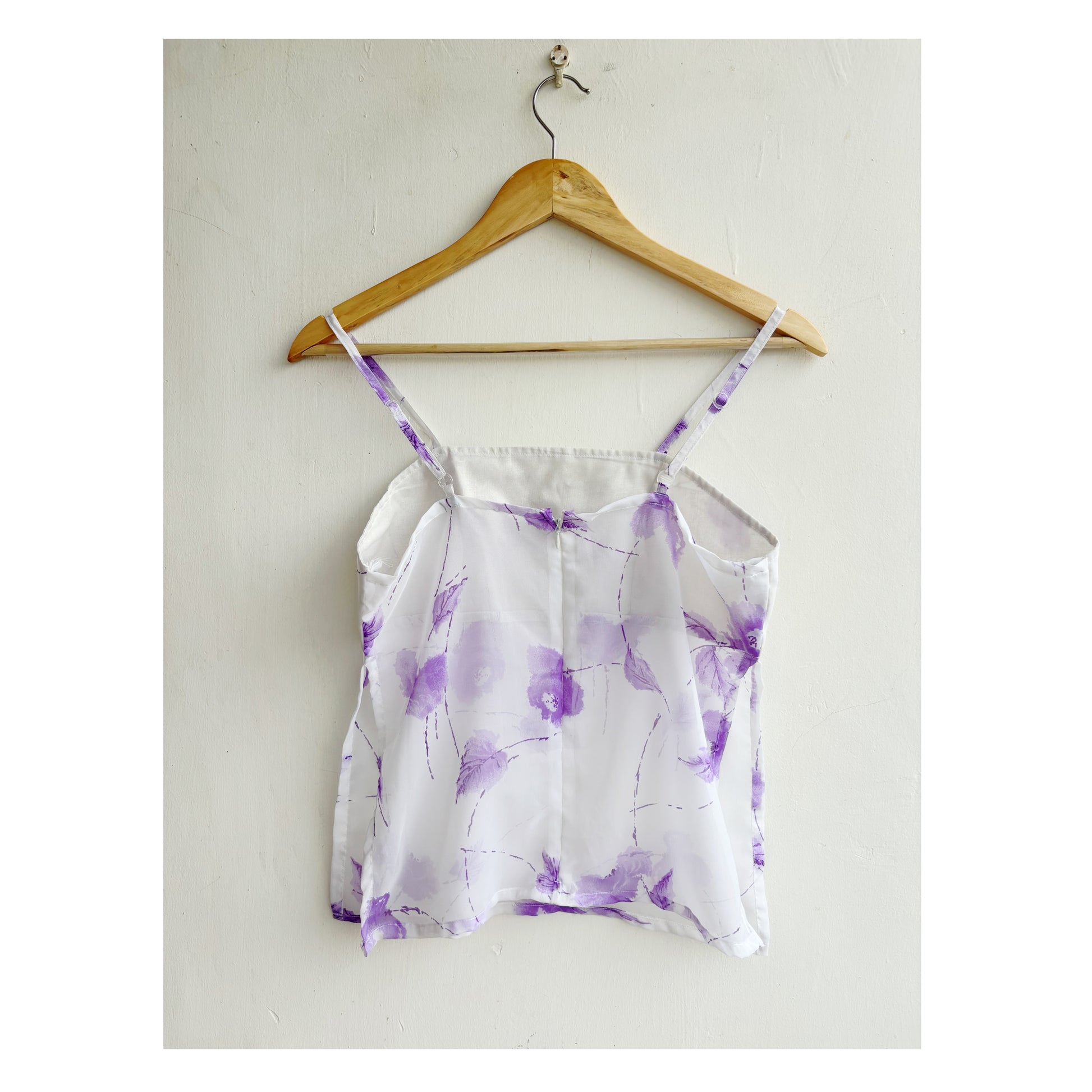 Chiffon. Bust lined. Adjustable straps. Side slits