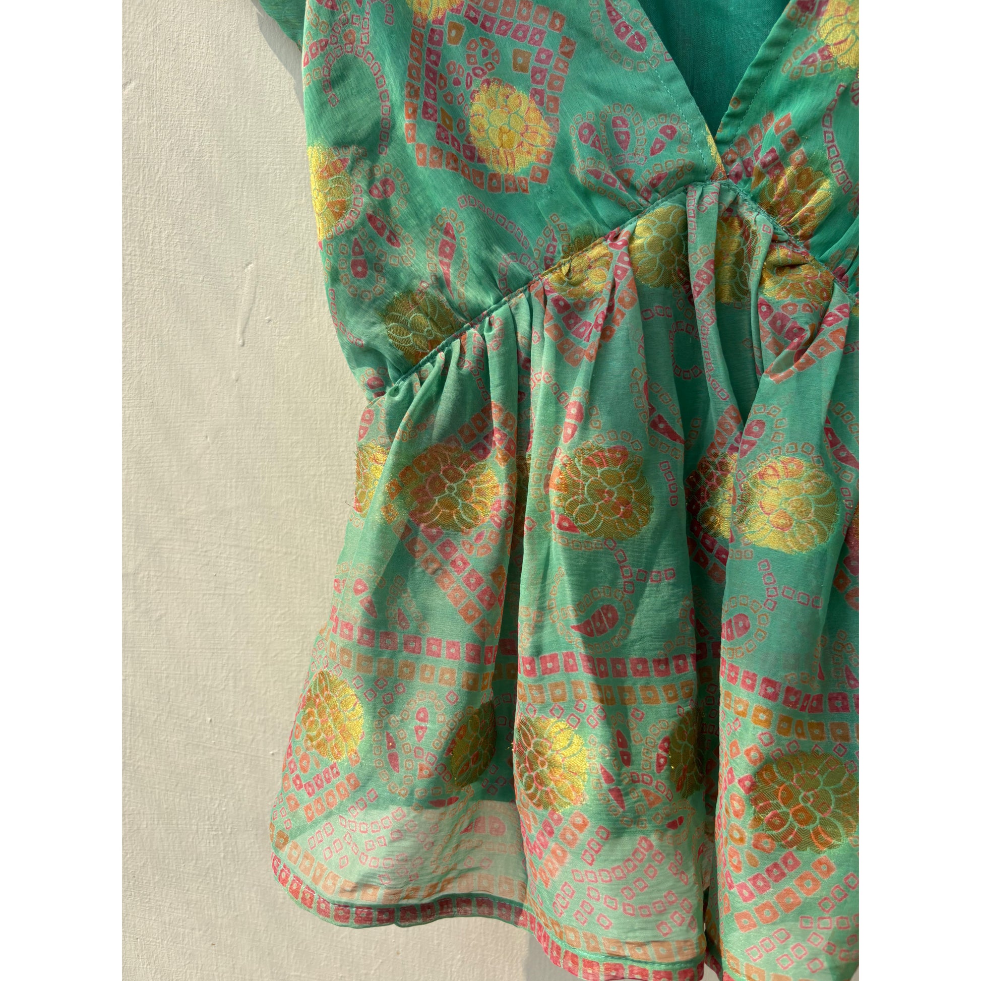 Vibrant ethnic-inspired motif with yellow and red accents throughout. The fabric has a soft, airy feel, and the silhouette includes a deep V-neckline and gathered waist for an easy, flattering fit. The sleeves are slightly puffed with elasticated cuffs for added comfort and style. This piece works well for both everyday wear and casual outings, infusing your look with bohemian flair