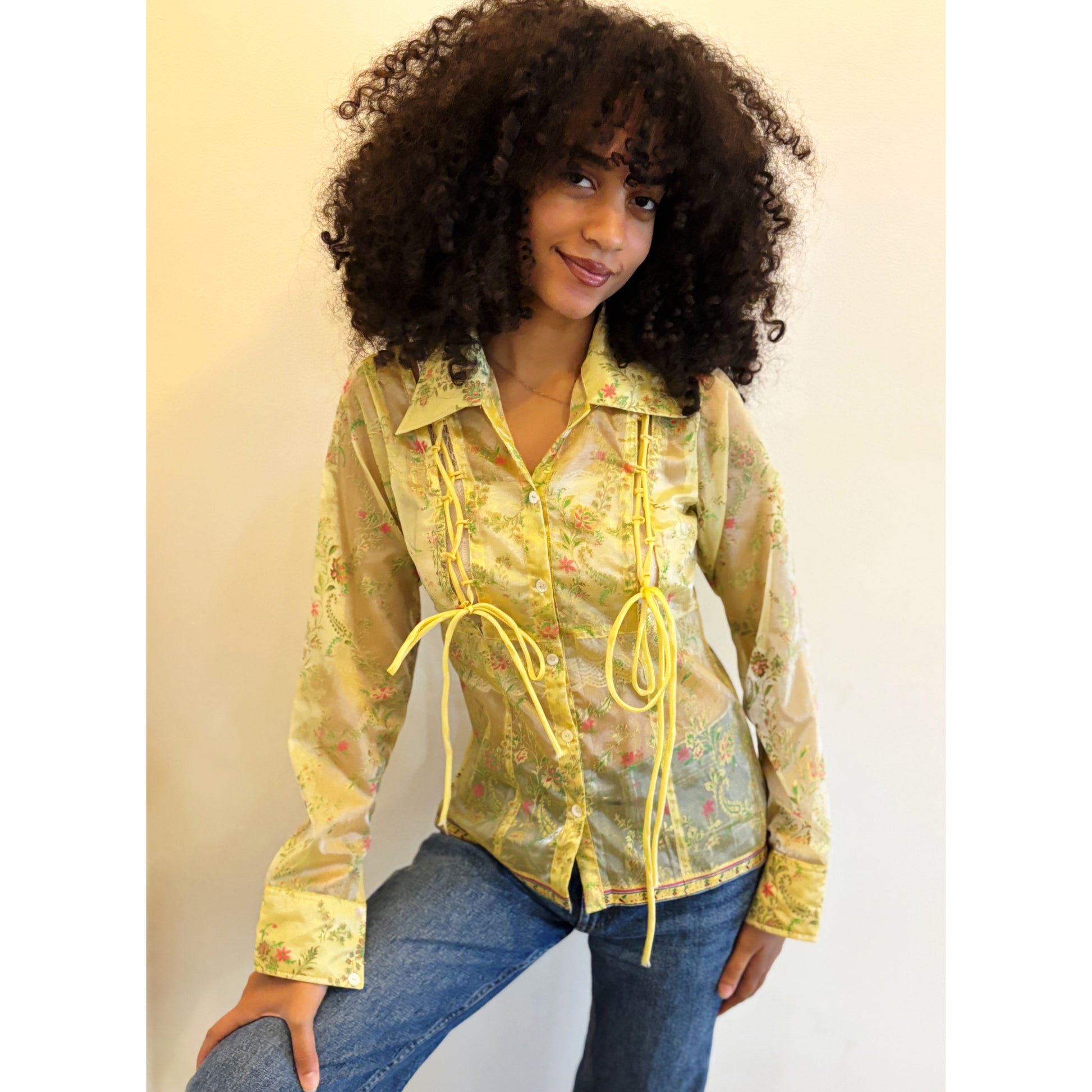 Made with organza fabric. Features a pointed collar, button-down front, and adjustable tie details at the waist. Finished with long sleeves and buttoned cuffs.