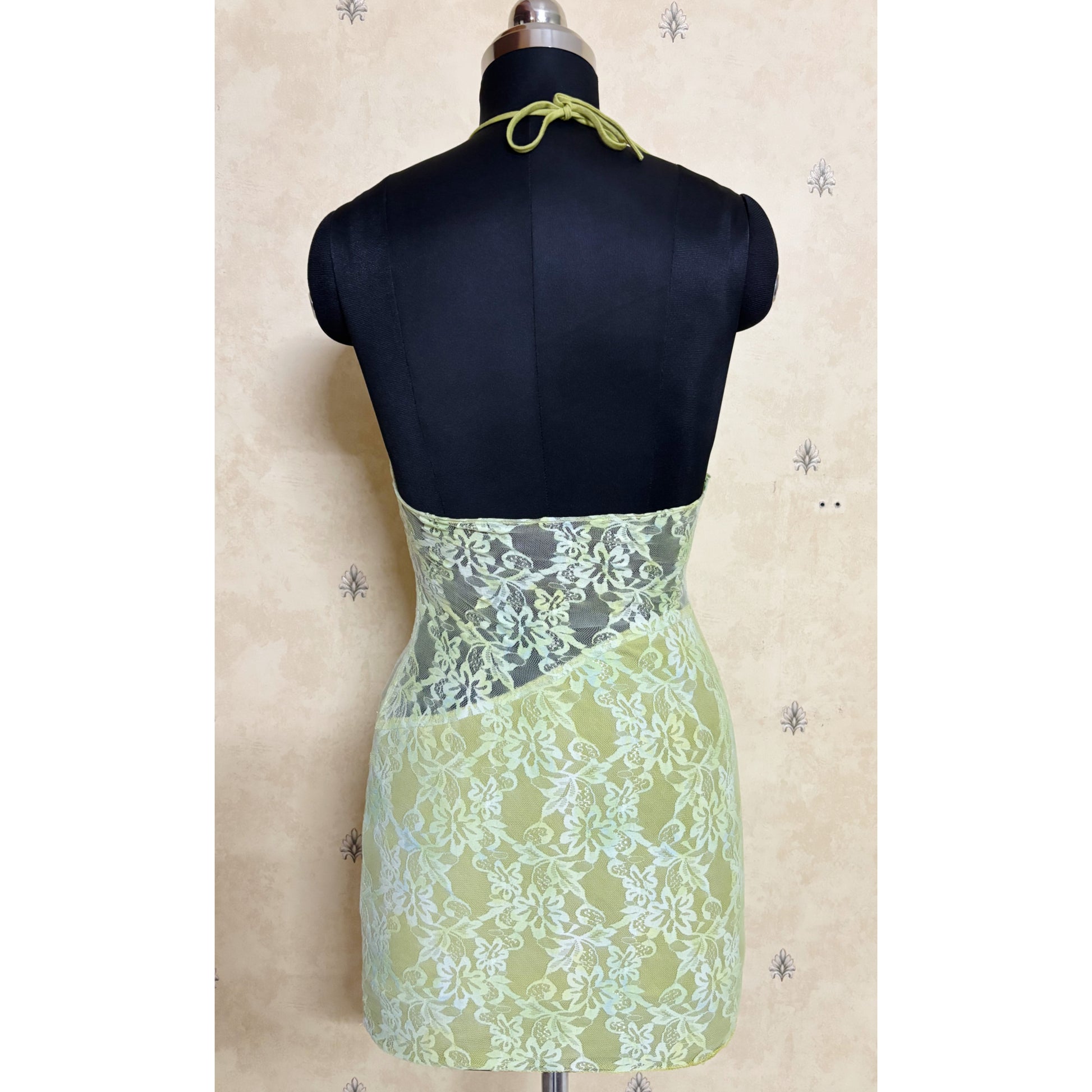 Made with highest quality lace and lined with modal knit, making this dress super smooth. It’s halter neck and has an asymmetrical sheer region. Stretchable and bodyfit.