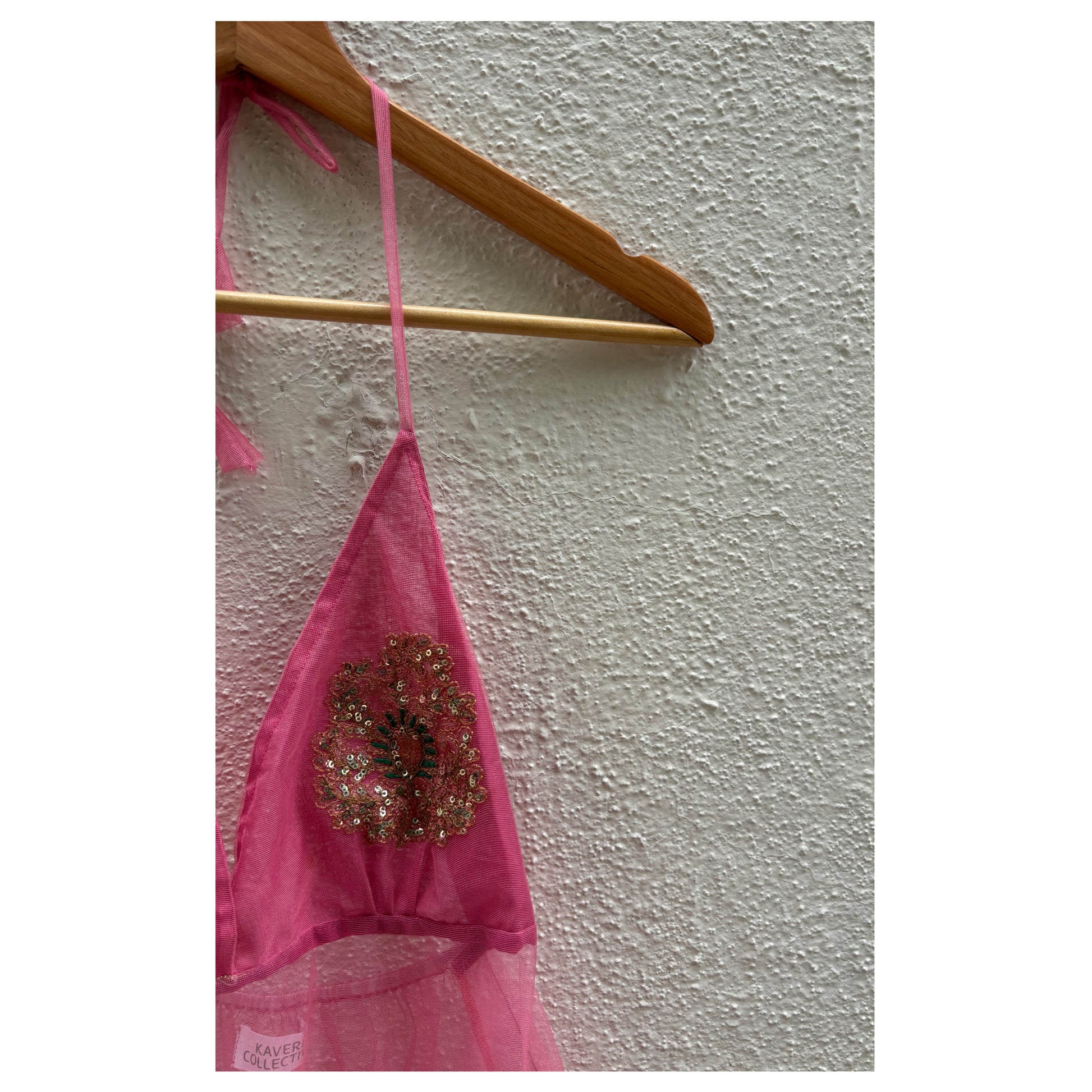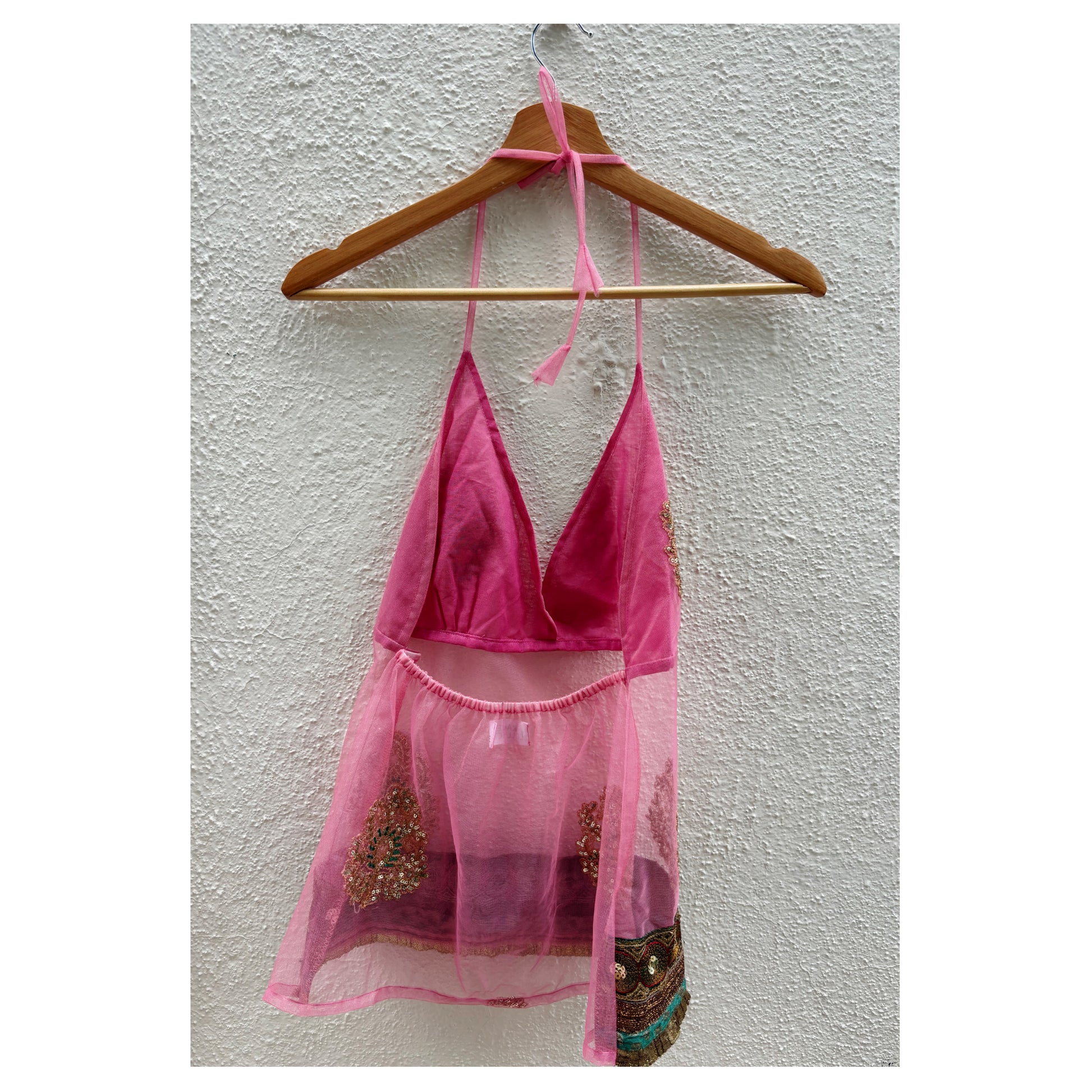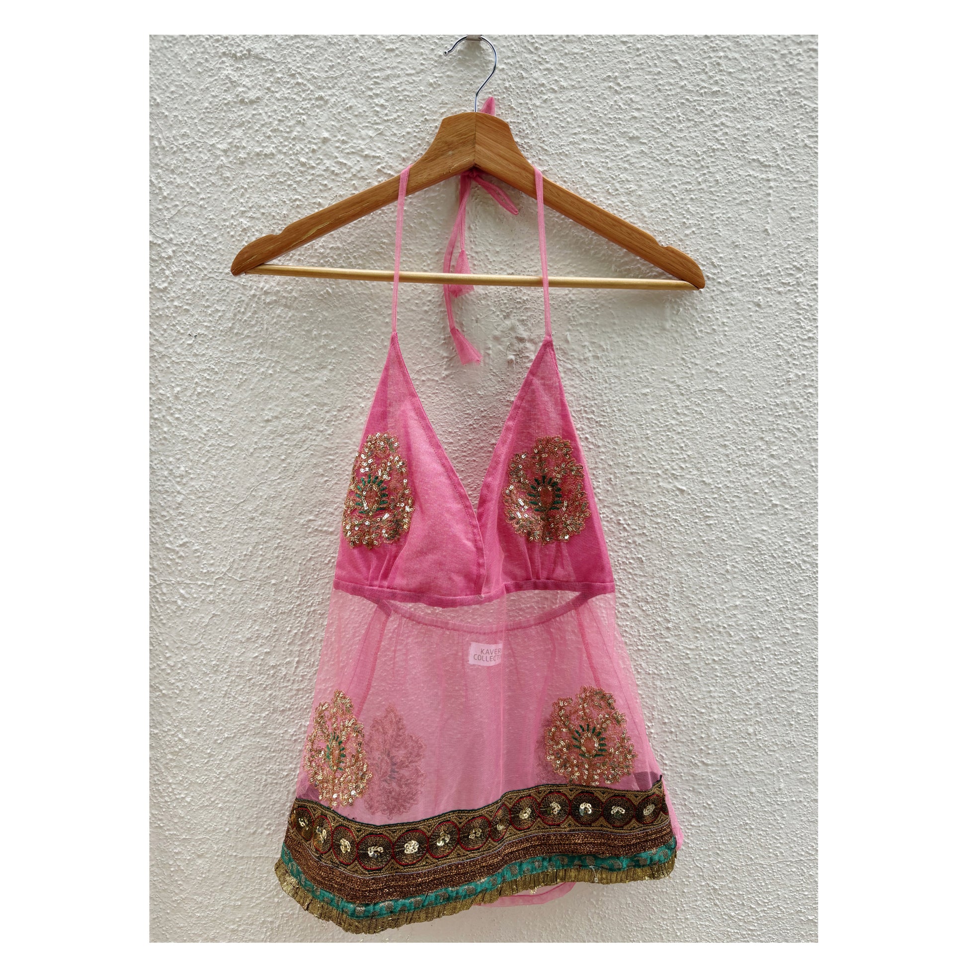 Halter top featuring gold sequin floral embroidery, sheer mesh detail, bust lined with cotton and a tie-back design. Perfect for festivals, summer parties, or bold Indo-fusion looks.