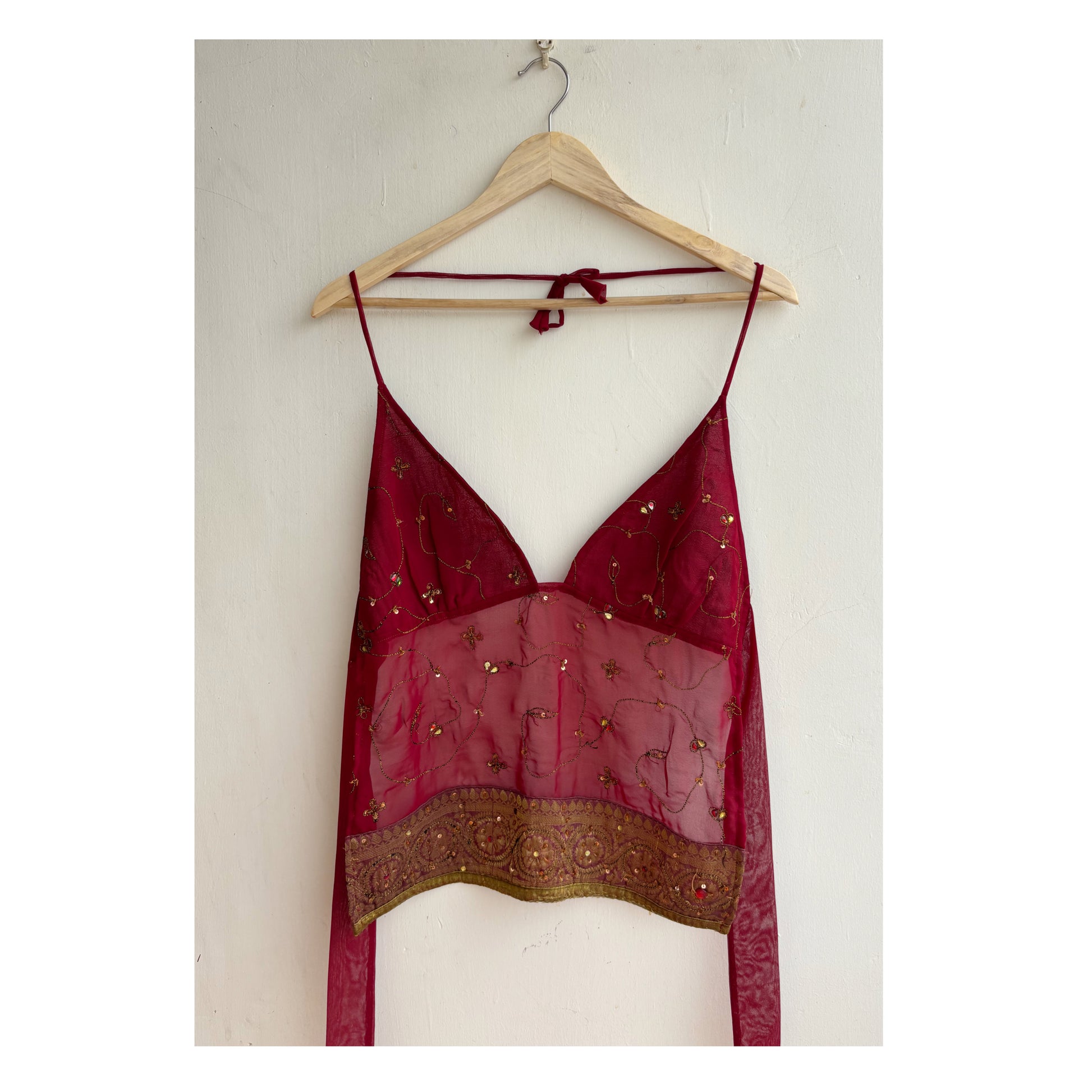 Georgette. Bust lined. Back knot. Halter neck. Sequins with taar work