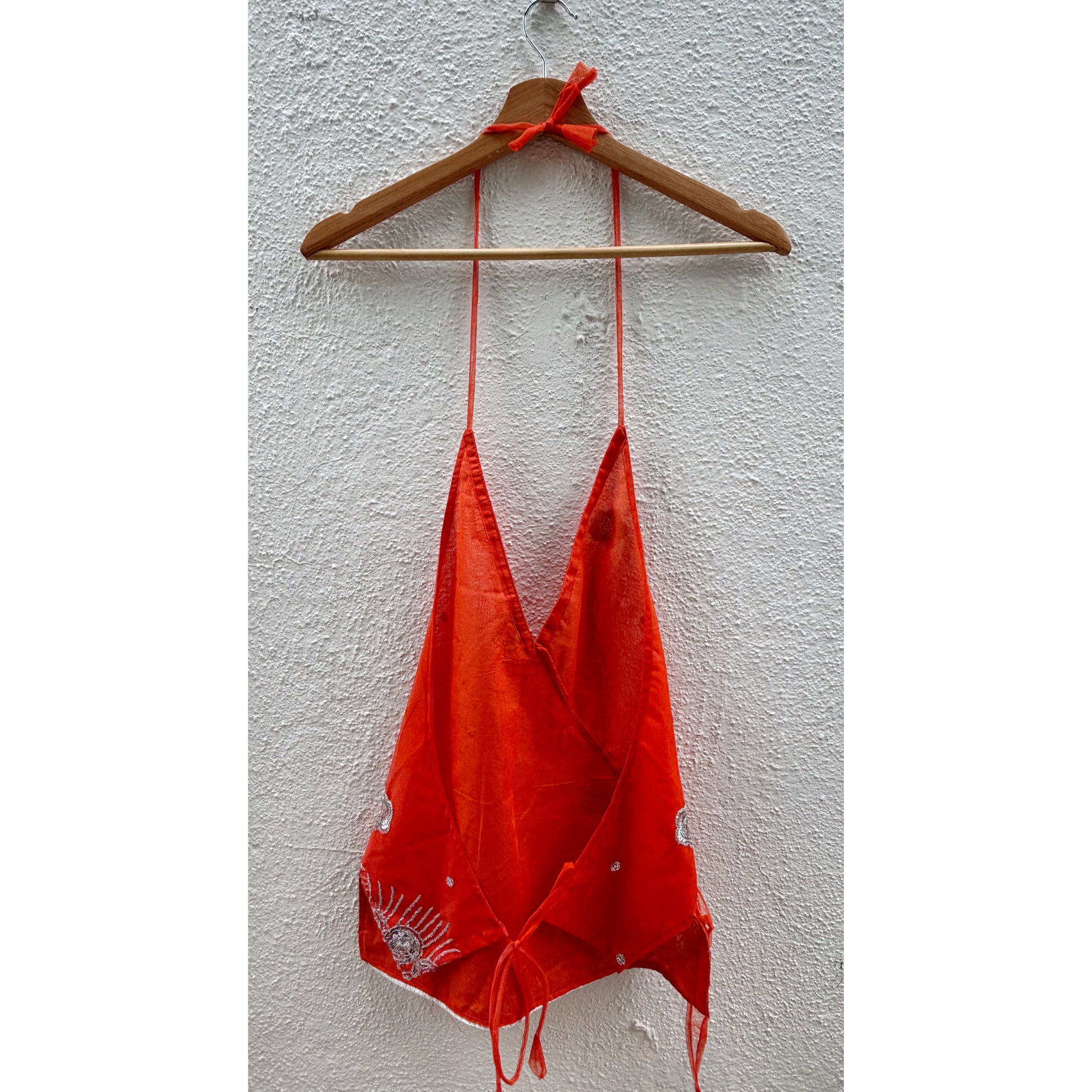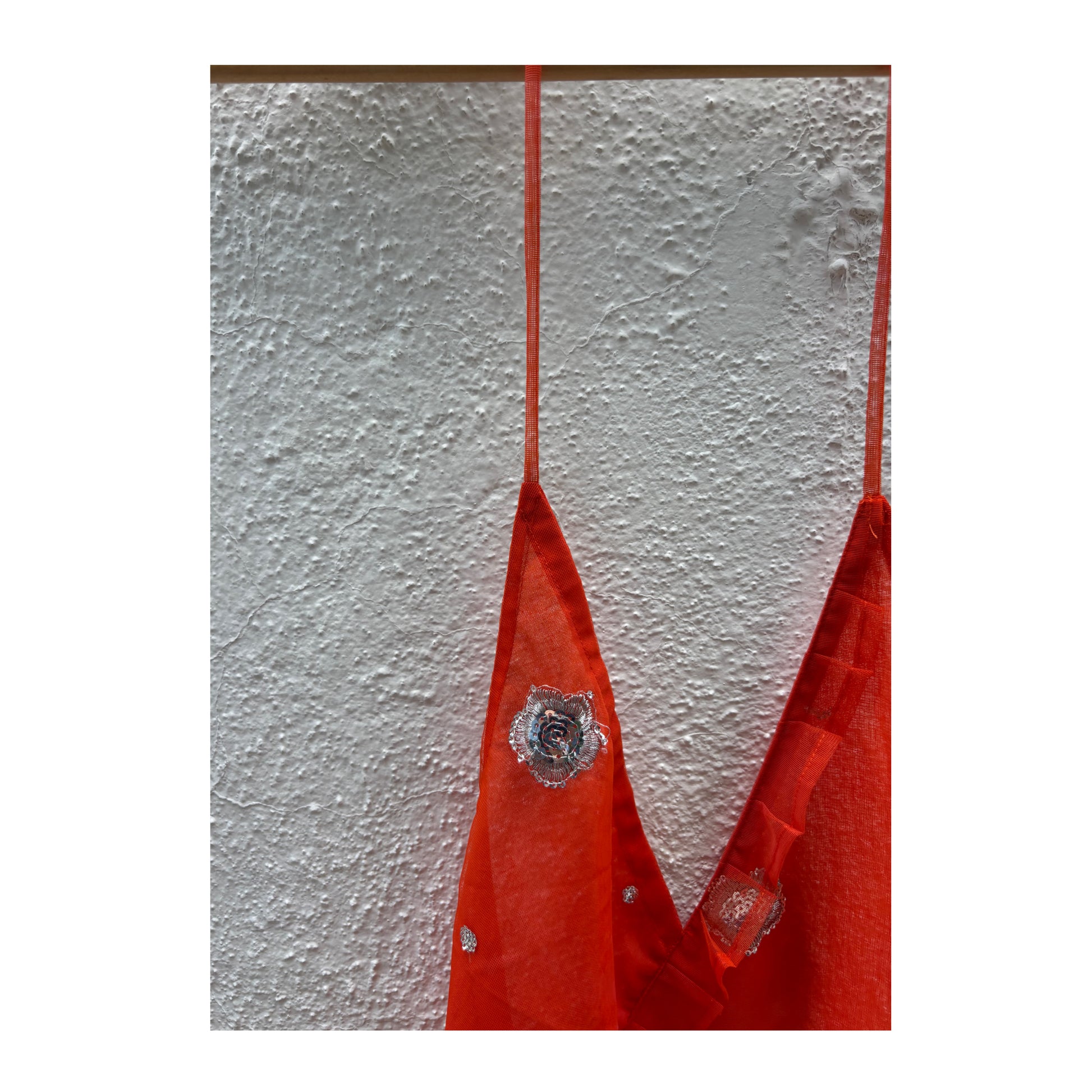 Net. Lined with cotton. Sequins work.Halter neck. Backless