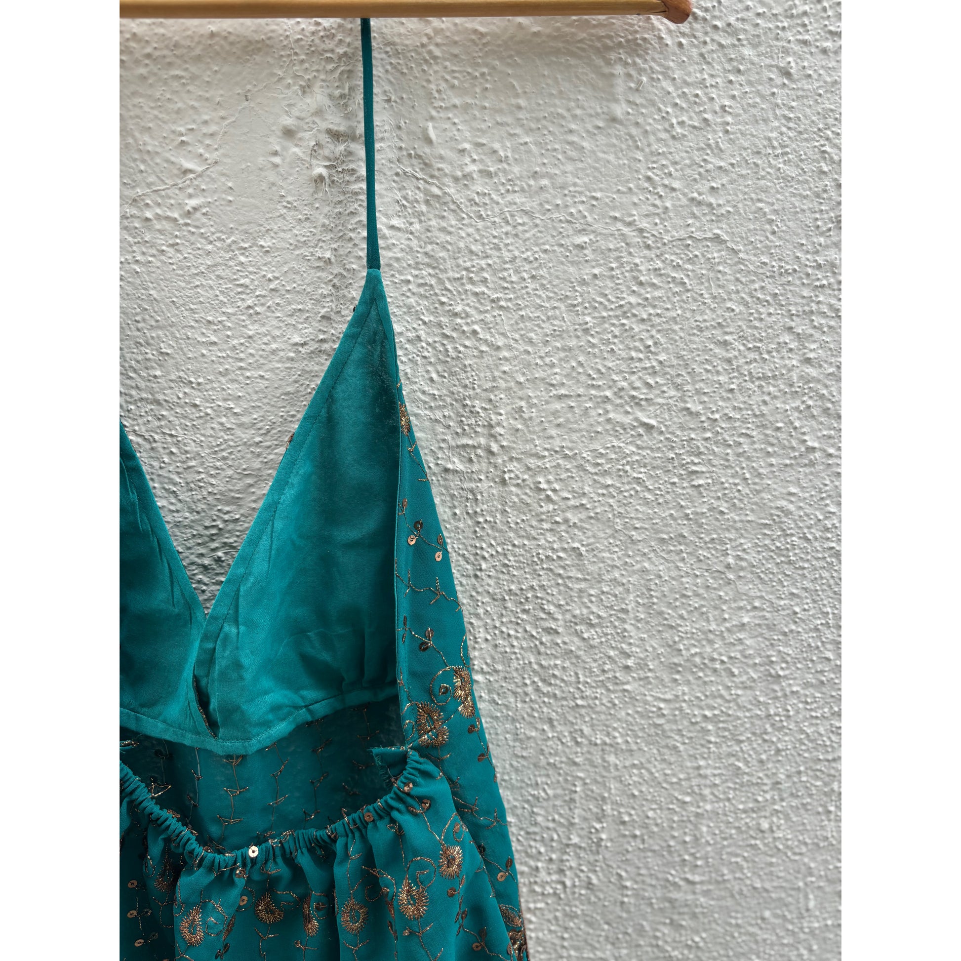 Shimmer in every step with this teal halter top adorned with intricate sequin work and a richly embellished gold border on organza fabric. Bust lined with cotton.